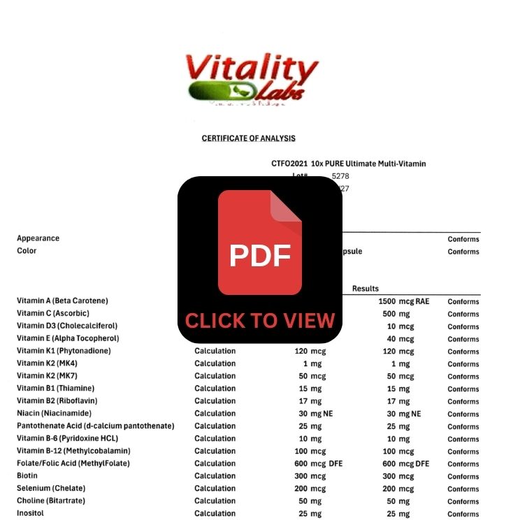Ingredients: Vitamin A (Beta Carotene), Vitamin C (Ascorbic Acid), Vitamin D3 (Cholecalciferol), Vitamin E (D-a-Tocopherol), Vitamin K1 (Phytonadione), Vitamin K2 (Menaquinone-4 (MK-4)), Vitamin K2 (Menaquinone-7 (MK-7)), Vitamin B1 (Thiamin Mononitrate), Vitamin B2 (Riboflavin), Niacin (Nicotinamide), Vitamin B6 (Pyridoxine HCL), Folate (as 5-Methyltetrahydrofolate Calcium), Vitamin B12 (Methylcobalamin), D-Biotin, Pantothenic Acid (as D-Caclium Pantothenate), Choline Bitartrate, Magnesium (as Magnesium Bisglycinate Chelate), Zinc (as Zinc Bisglycinate Chelate), Selenium (as Selenium Glycinate Complex), Manganese (as Manganese Bisglycinate Chelate), Chromium (as Chromium Nicotinate Glycinate Chelate), Molybdenum (as Molybdenum Glycinate Chelate), Inositol, 10xPURETM Formula 77.